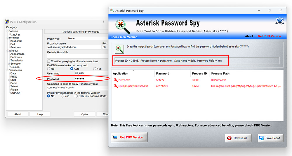 Screenshot 2:  Asterisk Password Spy revealing password from Putty.exe