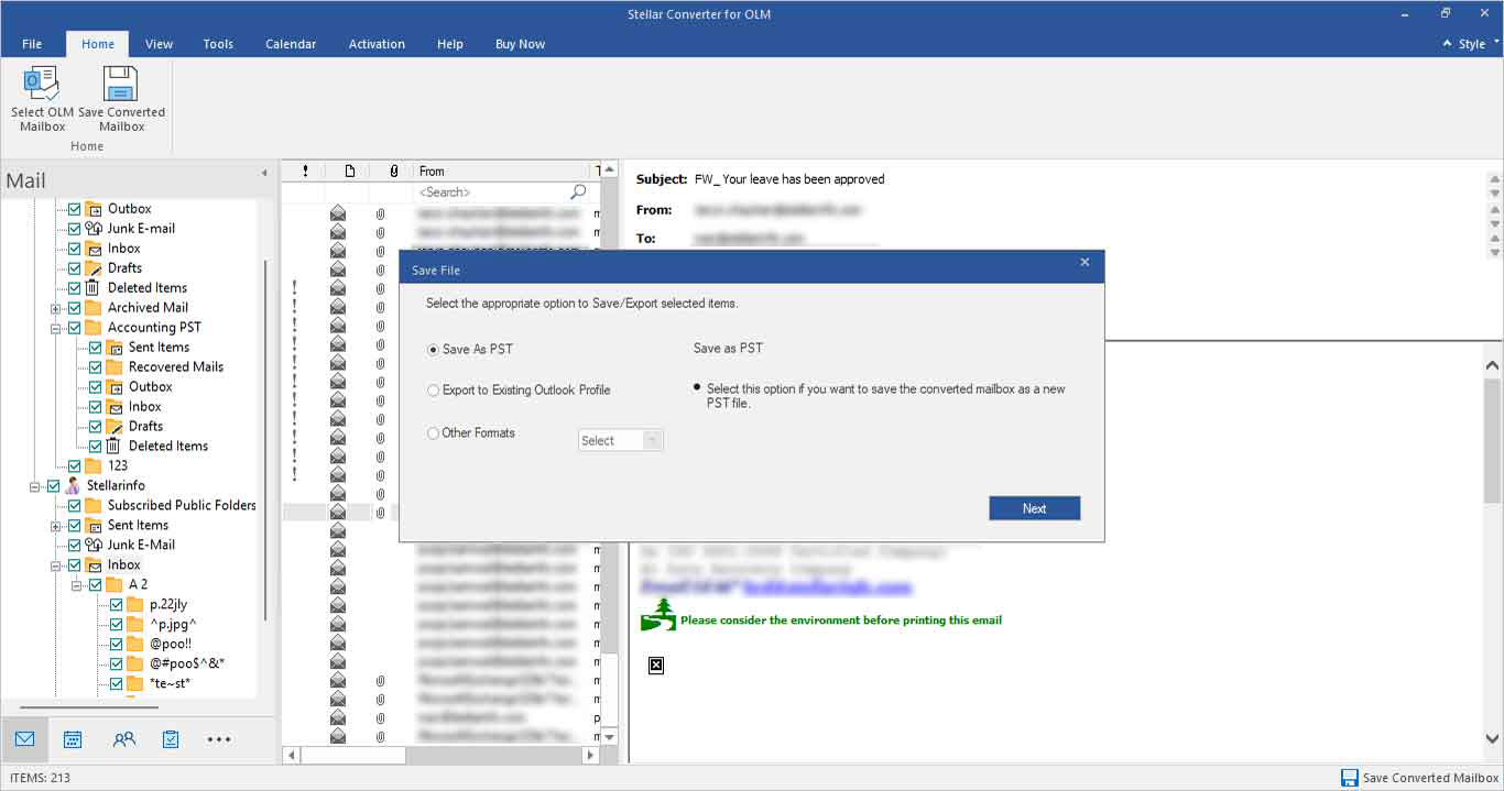 Smart saving options for converted files: Once you convert OLM file to PST, using Stellar converter for OLM, it saves the converted files in PST format. It does not only save files in PST format (.pst), but also in formats like MSG (for messages), EML (for emails) or convert OLM to PDF. After converting OLM files to PST, you can attach the converted files into an existing PST file or save as a new PST file.