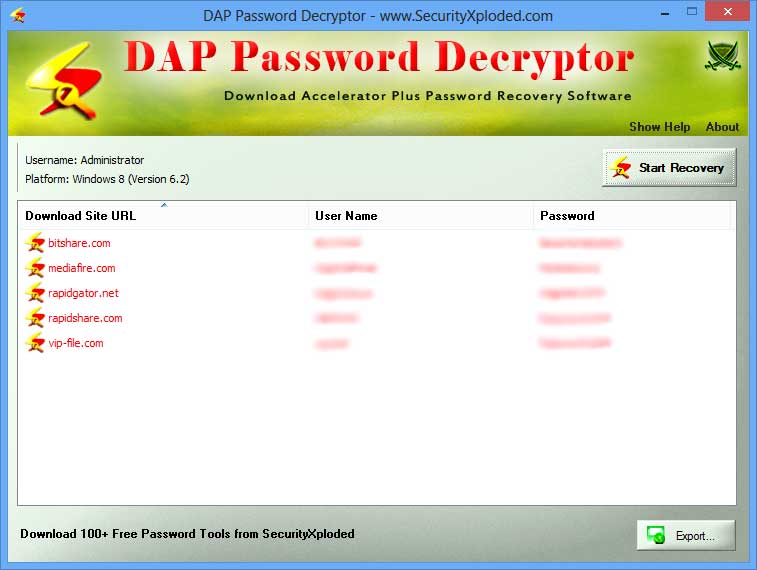 • Next click on 'Start Recovery' button. Instantly all the stored premium account passwords by DAP will be cracked & displayed as shown in screenshot 1 below.