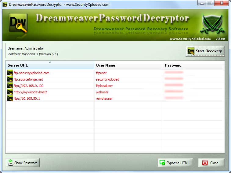 Dreamweaver Password Decryptor is not a hacking tool as it can recover only your stored passwords. It cannot recover the passwords for other users unless you have right credentials. Like any tool its use either good or bad, depends upon the user who uses it. However Author or SecurityXploded is not responsible for any damage caused due to misuse of this tool.