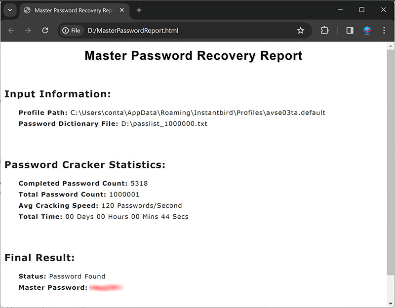 | Screenshot 2: Detailed Master Password Recovery report with statistics |