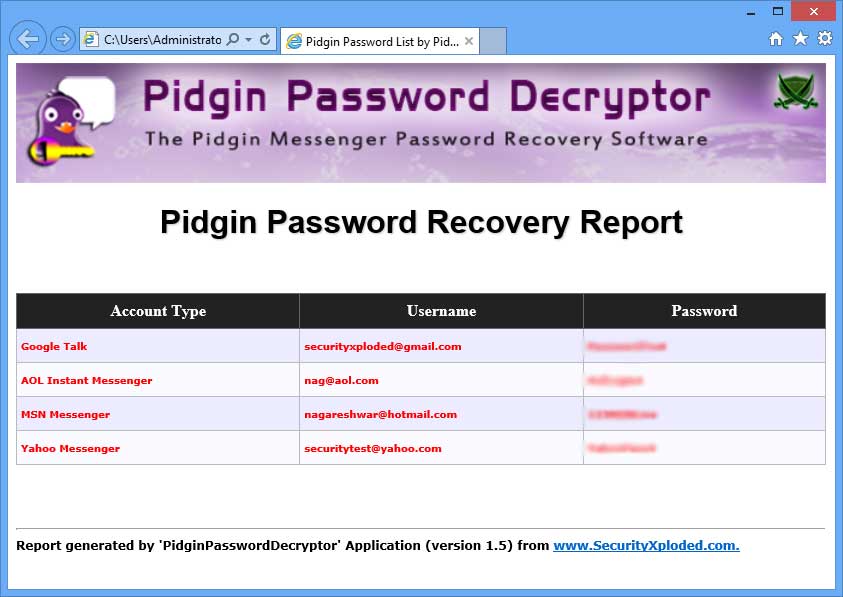C:\Program Files\SecurityXploded\PidginPasswordDecryptor