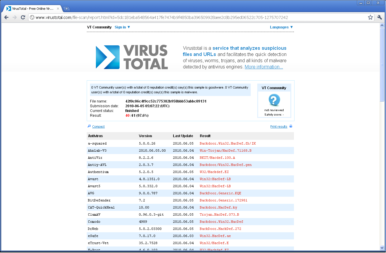 Online Threat Verification: Scan suspicious Processes/DLLs using online services such as VirusTotal, ThreatExpert, ProcessLibrary and Google.