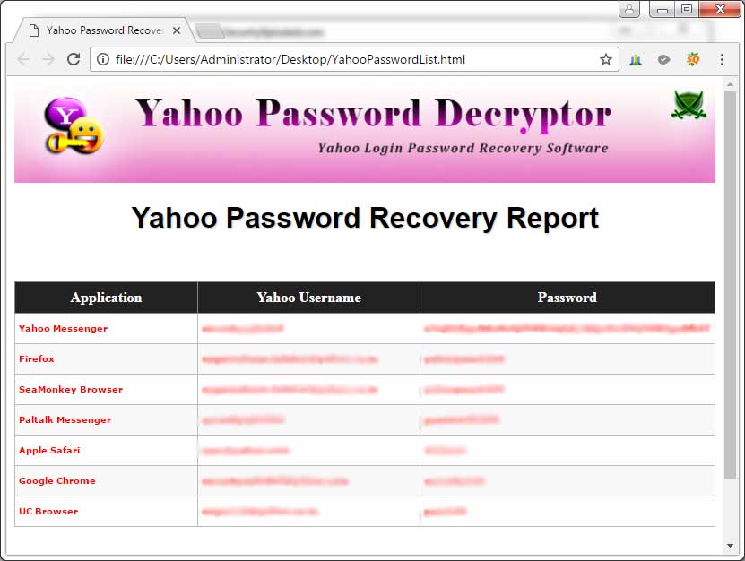 | Mega version featuring password hash recovery from Yahoo Messenger v7.x - v13.x. Includes feature to generate password recovery report in CSV (Comma-Seperated Values) file format. Also removed the support for command-line feature as now we have exclusive command-line tool - Yahoo Password Dump |