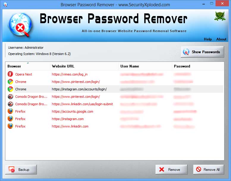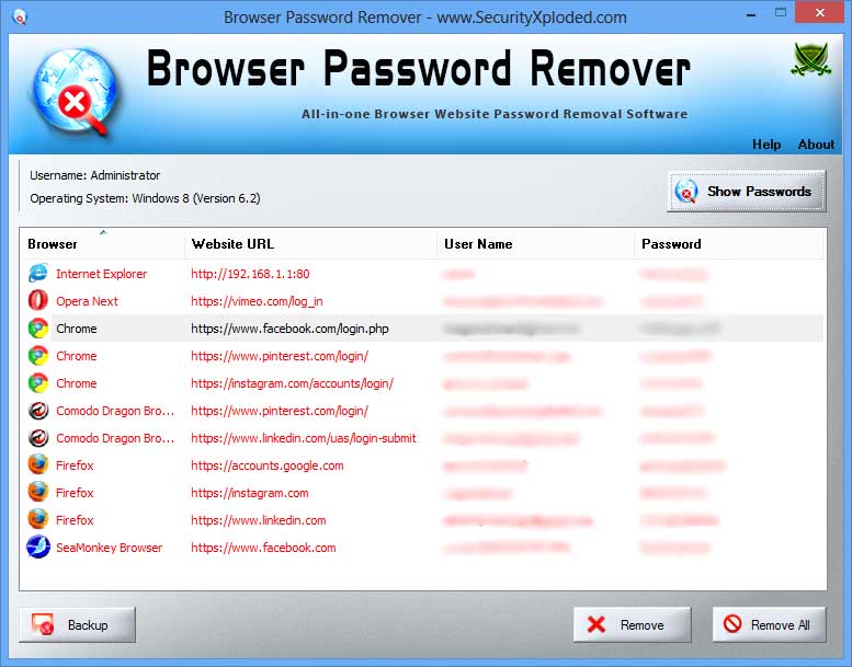 Browser Password Remover is the free software to quickly display and remove all the stored website login passwords from popular browsers. |