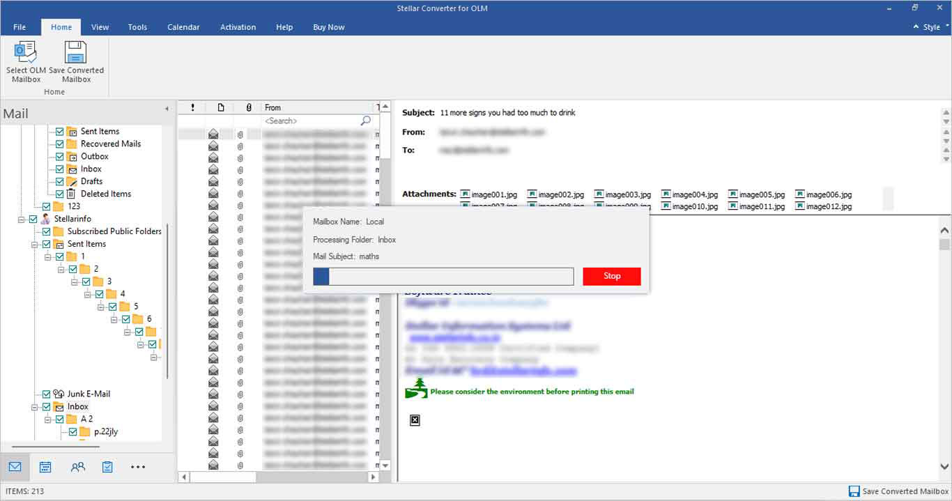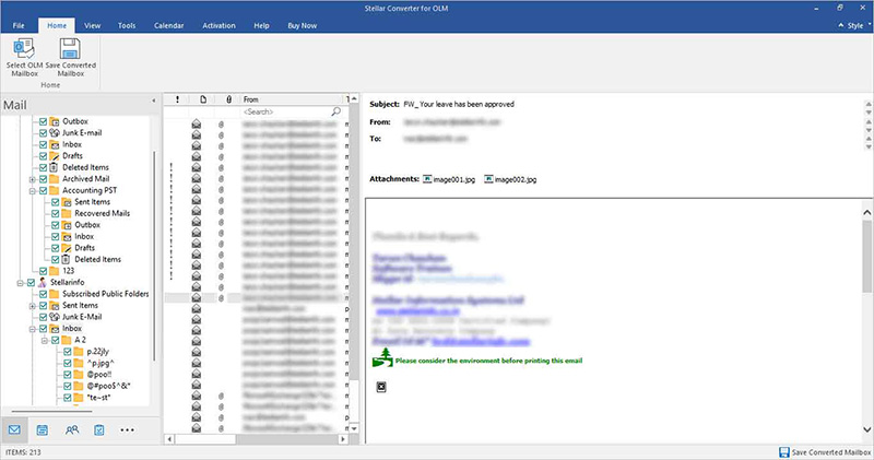 Preview of Converted OLM Mailbox items: There is a free preview option (in a three-pane window) with the software, allowing you to check the accuracy of the converted items. The left pane shows you the file name that you selected and the mailbox item folders in a tree structure. The converted OLM file (mail) list will display in the middle pane of the interface, while individual mail content is shown in the right pane.