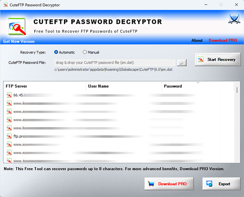| Major 2025 release with support for latest Windows 11 OS. Also works for latest CuteFTP version and fixed recovery from Cuteftp version 8.x. Also enhanced GUI interface & html report. Removed support for Windows XP. |