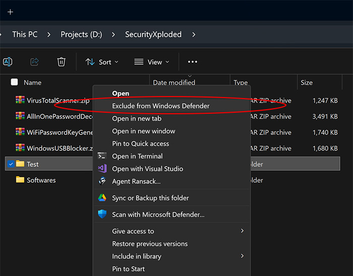• Exclude file or folder from Defender by just right clicking on it