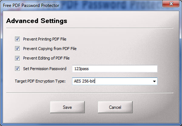 However if you want to set advanced restrictions such as copying/printing etc then you also need to set 'Owner Password' to prevent anyone removing these restrictions. You can easily set these restrictions along with password using 'Advanced Settings' dialog in PDF Password Protector.