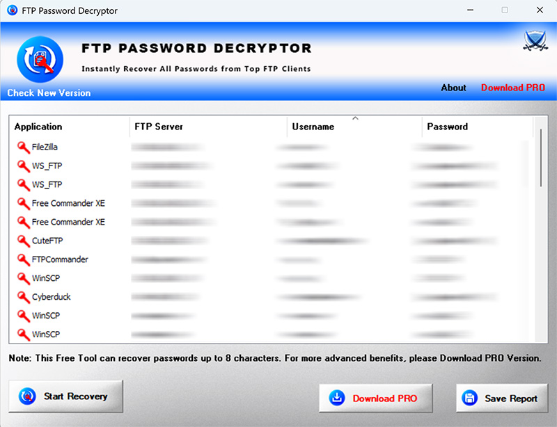 | New 2026 edition supporting password recovery from latest versions of all 30+ FTP clients. Also added support for 5 new FTP clients FreeCommander, Putty, RazorSQL, SFTP, LeapFTP. Enhanced GUI interface with new icon. Improved report. Manifest file updated with highestAvailable execution level. |
