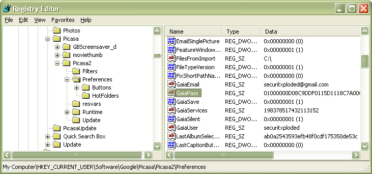 picasa 2 registry location for storing the settings |