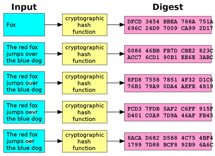 For example, you can take a password and generate a fingerprint or hash from it at the point of sign-up. If an instance of the fingerprint is encountered again in the future, the algorithm knows that this represents the same password. Thus, the login is secured but the original password can never be retrieved. The hash process itself involves a lot of aggressive mixing and mashing to produce an entirely new output. Think of it as mixing three different colors to get an entirely new color. It would be quite difficult to segregate the original three colors. Hence, the one-way functionality. The hash functionality is demonstrated below: