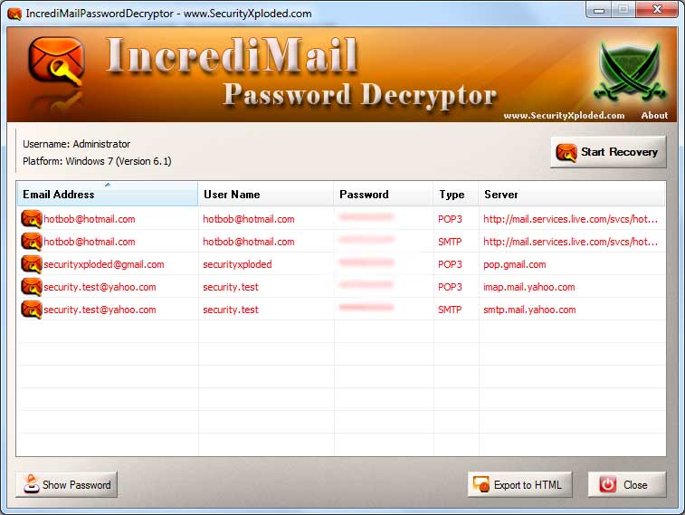 IncrediMailPasswordDecryptor is not a hacking tool as it can recover only your stored passwords. It cannot recover the passwords for other users unless you have right credentials. Like any tool its use either good or bad, depends upon the user who uses it. However Author or SecurityXploded is not responsible for any damage caused due to misuse of this tool.