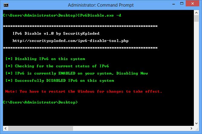 IPv6 Disable is very easy to use tool. Since it is command-line/console based tool, you have to launch it from the command prompt (cmd.exe).