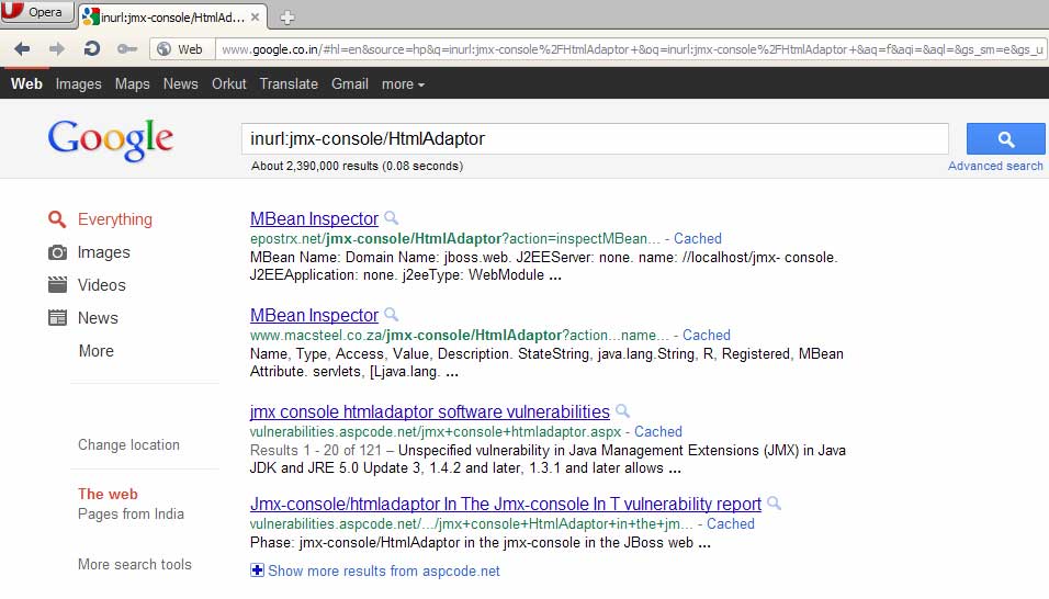 We formed a Google dork to search jmx consoles: inurl:jmx-console/HtmlAdaptor and here is the result,