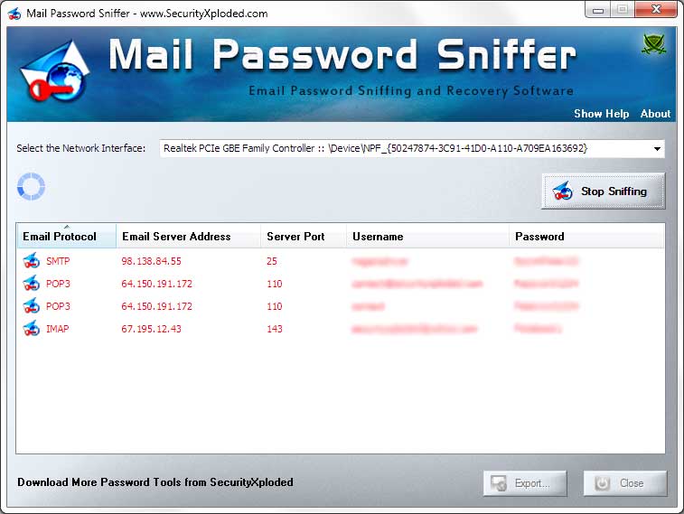Mail Password Sniffer is the free Email Password Sniffing and Recovery Software to recover mail account passwords passing through the network.