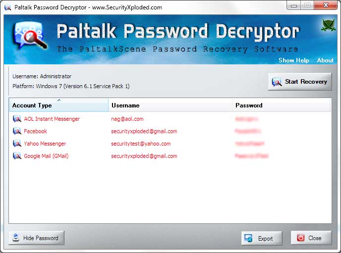 | Mega version featuring renovated GUI interface, support for password recovery report in CSV file, quick download link for more password tools etc. Successfully tested with latest Paltalk Messenger version v11.4 |