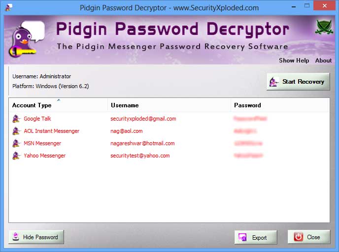 Pidgin Password Decryptor helps in automatically recovering all such passwords