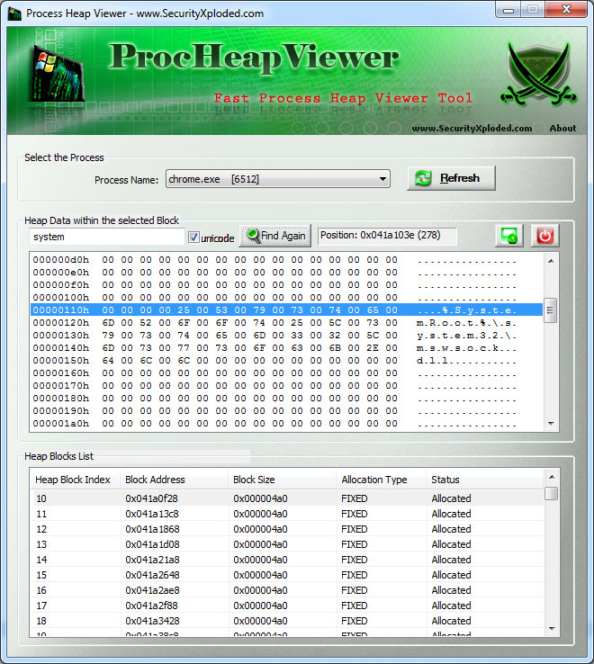 | Support for viewing the heap blocks and heap data by scrolling