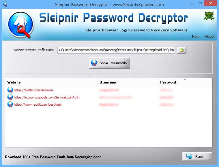 Sleipnir Password Decryptor helps you to easily recover these website passwords from Sleipnir password store. On start, it automatically detects default profile path of Sleipnir browser. You can also specify different profile path in case it is not present in default location.