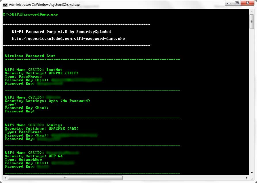 | WiFi Password Dump is very easy to use tool. It is command-line based tool, hence you have to launch it from the command prompt (cmd.exe) as Administrator.