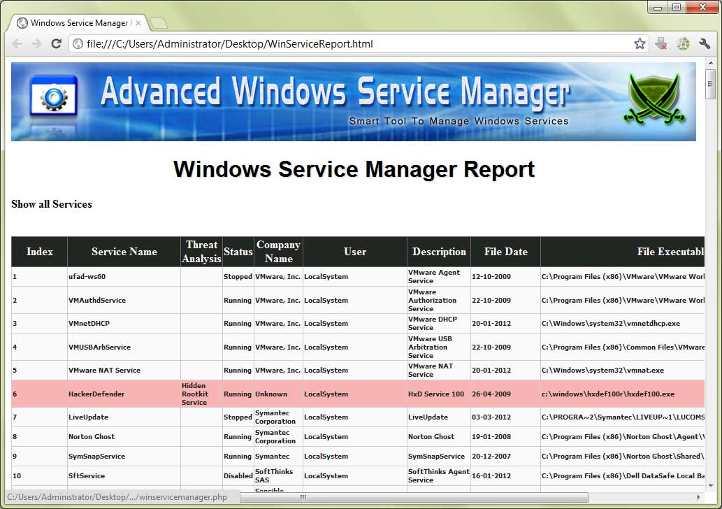 Some of the unique features include Detection of Malicious/Rootkit Services, Automatic Threat Analysis, Service Filter mechanism, Integrated Online Virus/Malware Scan, Color based Threat Representation, HTML/XML based Service Report etc.